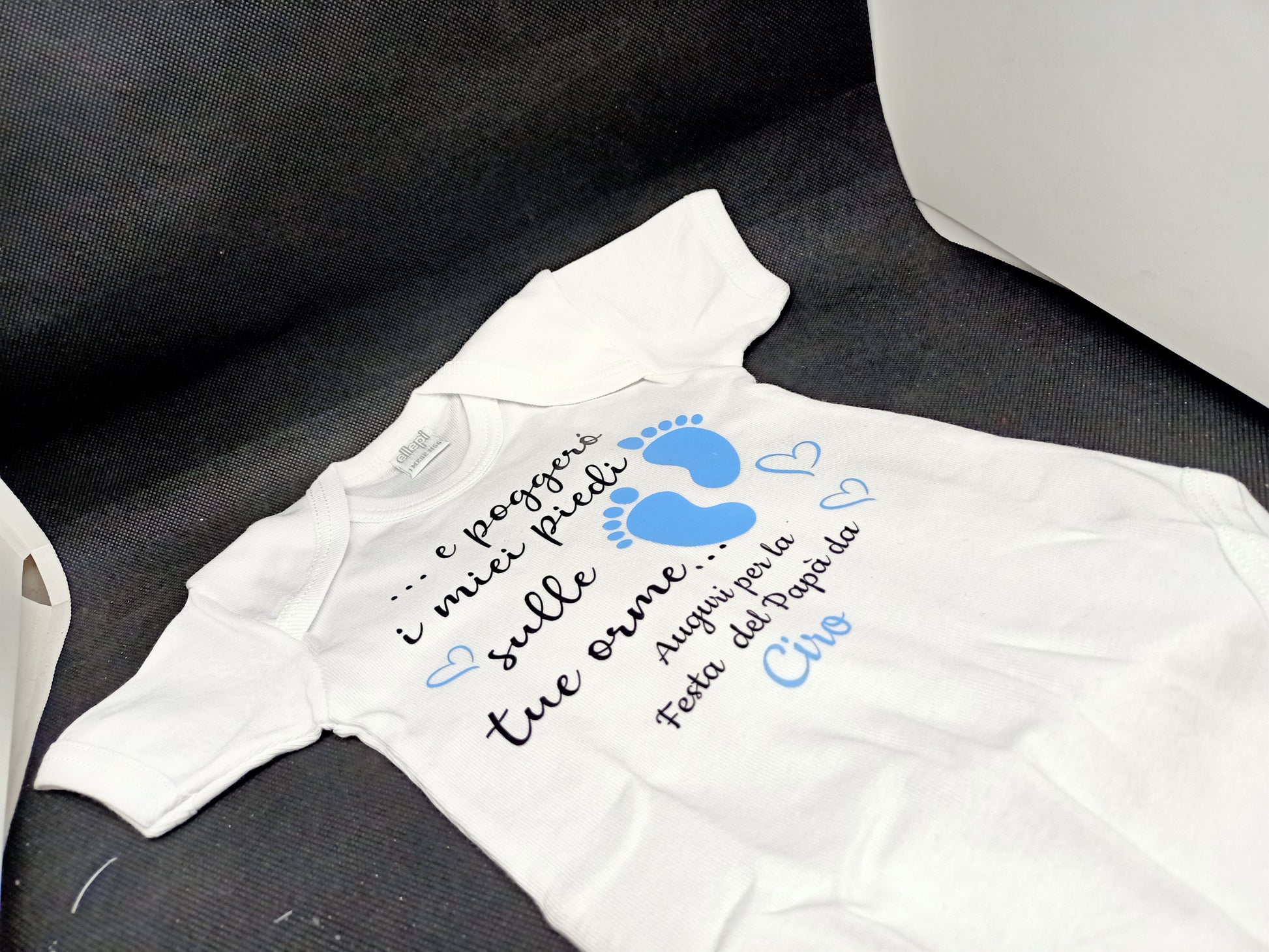 Che cosa c’è di meglio di un abbraccio tra papà e figlio? Un abbraccio con un body personalizzato con la loro foto e una frase che esprime tutto il loro affetto
